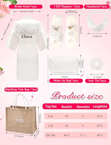 • You will receive a nice wedding robe set including 1 short satin robe, 1 bride tote bag and 1 makeup bag, 1 pair of bride wedding slippers, 1 eye mask and 1 hairband.